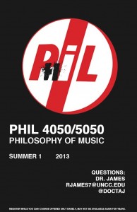 My summer 2013 course in Philosophy of Music is open to both undergrads and grad students from UNCC & elsewhere. Registration opens in a month!