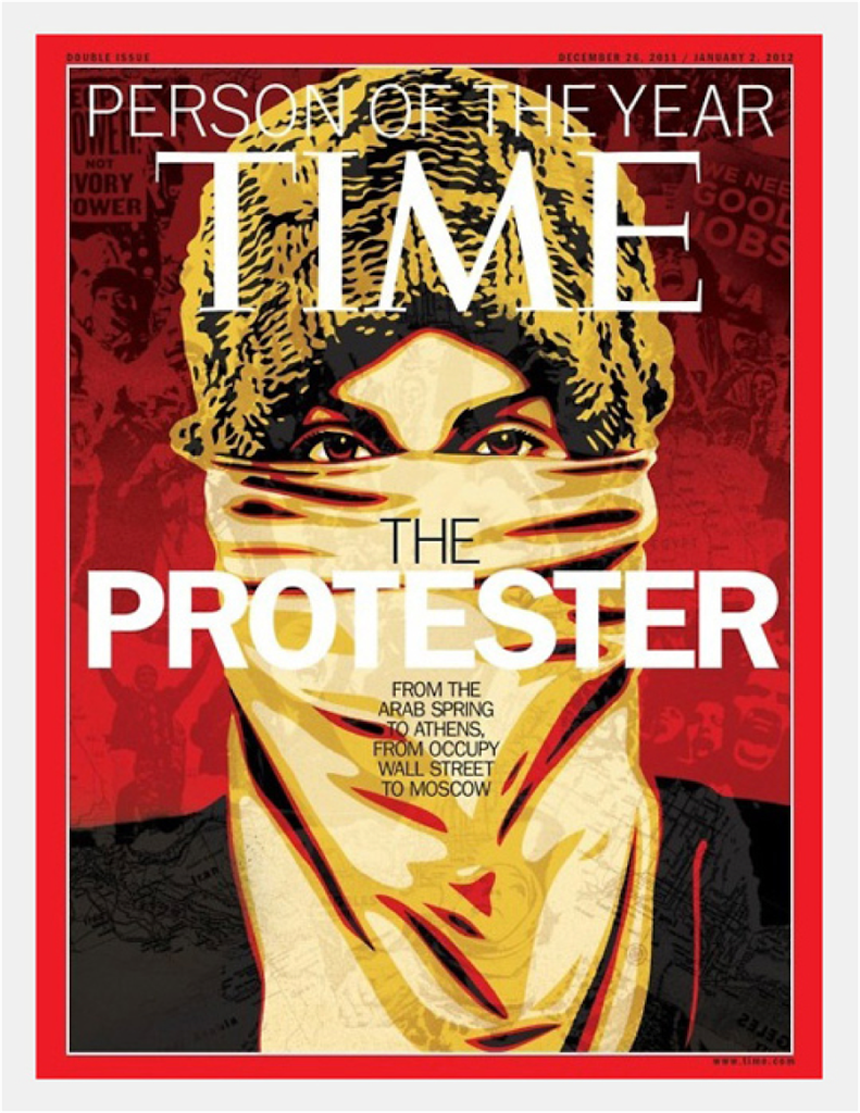 The appeal of “black” culture for (bourgeois) white (male) audiences was its apparent oppositionality; now that this very stereotypically “oppositional’ black masculinity has been thoroughly co-opted by the culture industry, white hipsters need to find new symbols with which to demonstrate their radical chic—I mean, “cred.” I discuss this extensively in my article on Kanye West and Shepard Fairey. What’s notable about the cultural/political milieu of 2011 is the way this same logic of postmillennial hipness got seriously mainstreamed in/by mainstream media comparisons between OWS and the Arab Spring. OWS protestors, who are overwhelmingly white (and majority male), were compared, and sometimes compared themselves, not to African-American civil rights movements, but to various recent Middle-Eastern (who I’m assuming are not uniformly “Arab” in ethnicity…) and North African anti-government movements. This is epitomized in Time magazine’s cover illustration of its’ Person of the Year, “The Protestor”—an image rendered, notably, by Fairey, in the style of his other postmillennial portraits of radicalized non-Western women of color (which I discuss in the article above).