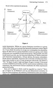 In his discussion of “intersecting contracts” in Contract & Domination, Charles Mills includes a chart depicting the relative positions of white men, black men, white women, and black women, vis-à-vis one another and, more importantly, to full moral/political “personhood.” This chart has two axes: race is the Y axis, gender the X axis. Mills uses this chart to illustrate his claims about the intersection of the “racial contract” with the “sexual contract” to form what he calls “racial patriarchy.” He’s arguing that racia-sexual contracts create white men as “full persons,” nonwhite men and white women as “subpersons,” and nonwhite women as “non-persons.”