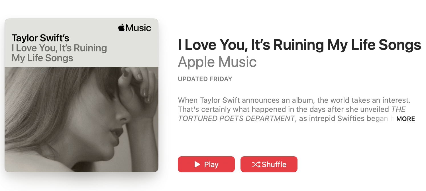In early April 2024, Taylor Swift released five Apple Music playlists that reorder her old work into five vibes, each based on one of the stereotypical “stages of grief”: denial, anger, bargaining, depression, and acceptance.